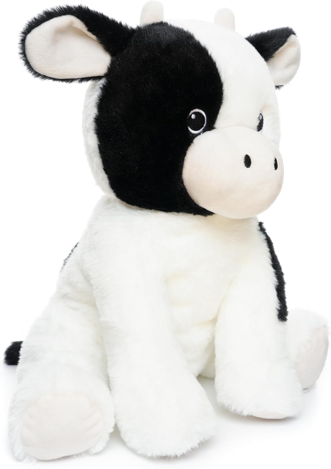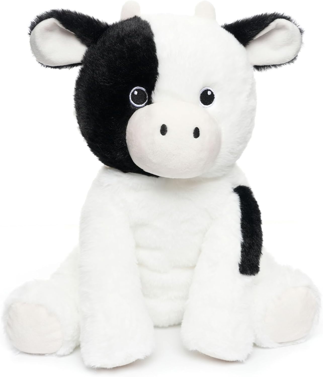 - Black and white color: With its classic black and white coloration, this cute stuffed animal cow features the iconic markings of a real cow. The contrasting black and white fur gives the cow a visually appealing appearance, making it stand out and catch the eye. The black spots against the white background add a touch of whimsy and charm, making the cow even more adorable