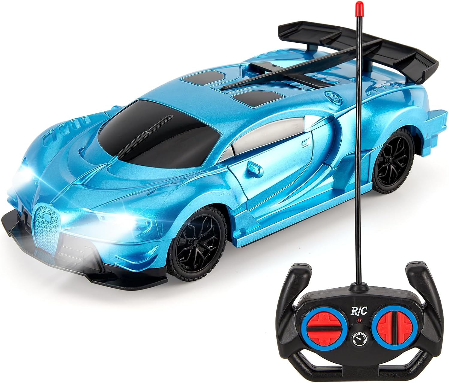 - Bright Headlights – The remote control car features bright LED lights that can run both day and night. 1/24 Scale car model with striking blue design. With unique strong tires and allows to drive on various terrains.
